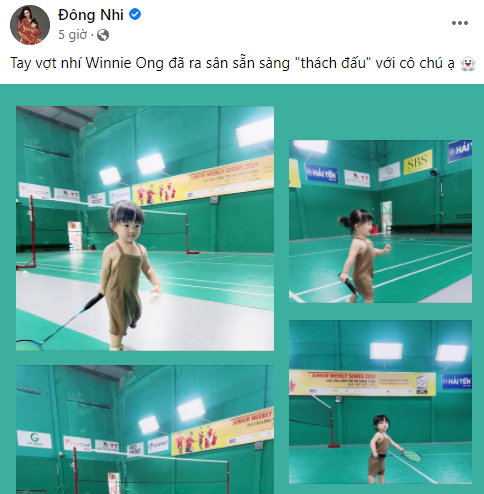 Cụ thể, trên trang cá nhân của mình, nữ ca sĩ Đông Nhi đăng hình ảnh hai mẹ con đi đánh cầu lông cùng nhau kèm caption: "Tay vợt nhí Winnie Ong đã ra sân sẵn sàng "thách đấu" với cô chú ạ".