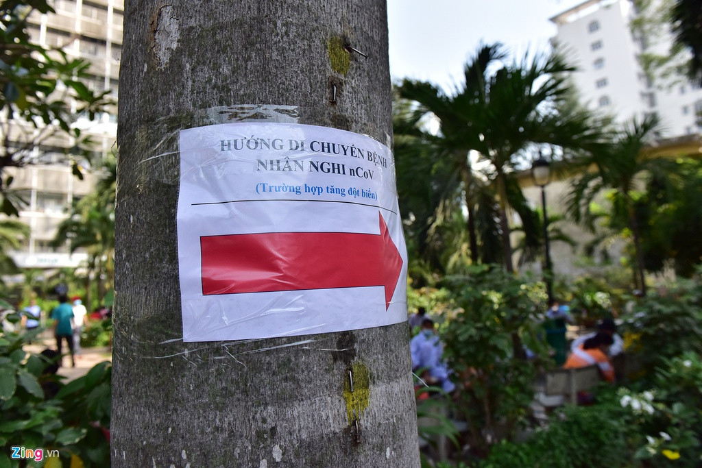 Bệnh viên Chợ Rẫy dán dày đặc từ ngoài cổng vào trong các bảng hướng dẫn hướng di chuyển vào khoa Bệnh Nhiệt đới cho bệnh nhân nghi nhiễm nCoV.