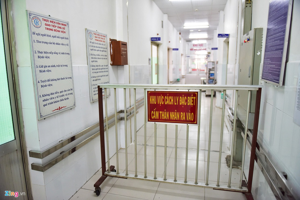 Bảng cấm khu vực cách ly được dựng sát phía ngoài cửa, cách khá xa phòng điều trị bệnh nhân còn lại của Khoa Bệnh nhiệt đới.