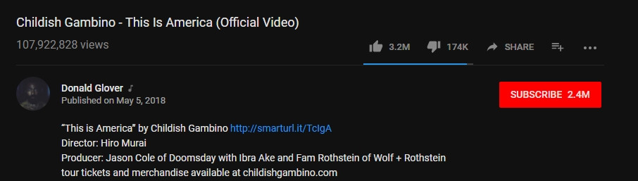 Mới đây, MV This Is America đã xác lập thành tích 100 triệu view trong 1 tuần, chỉ xếp sau các MV đình đám như Hello của Adele (4 ngày) và Wrecking Ball của Miley Cyrus (6 ngày). Người thể hiện ca khúc là rapper Donald Glover, còn được gọi là Childish Gambino - một cái tên chưa quá thân quen với khán giả Việt Nam.