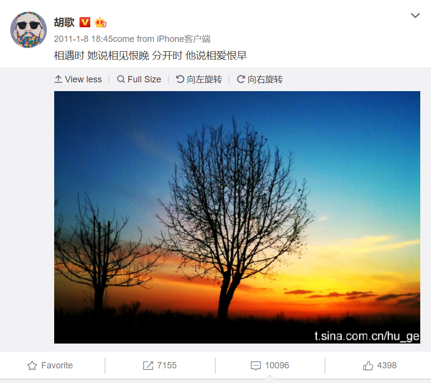 Tuy nhiên, khi tìm hiểu rõ, bức hình mà các trang báo đề cập lại là hình cây ngô đồng với dòng caption: "Lúc gặp nhau nàng nói chỉ hận gặp nhau quá muộn, lúc chia tay hắn nói chỉ hận yêu nhau quá sớm", được Hồ Ca đăng vào ngày 08/01/2011, tức trước ngày kết hôn của Dương Mịch và chồng cũ những 2 năm. Nhiều người hâm mộ cho rằng, lời này của Hồ Ca là dành cho Tiết Giai Ngưng, người tình sâu đậm nhất từ trước đến nay của Hồ Ca nhưng lại không có được một kết thúc đẹp.