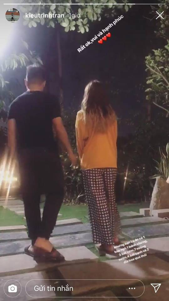 Trong khi dân mạng còn đang bán tín bán nghi về mối quan hệ của 2 người thì mới đây cặp đôi bất ngờ xuất hiện trên story của người chị thân thiết Kiều Trinh. Cô đăng tấm ảnh chụp dáng lưng 2 người đang đi dạo rất vui vẻ kèm đó là dòng trạng thái: "Rất ok, vui và hạnh phúc".