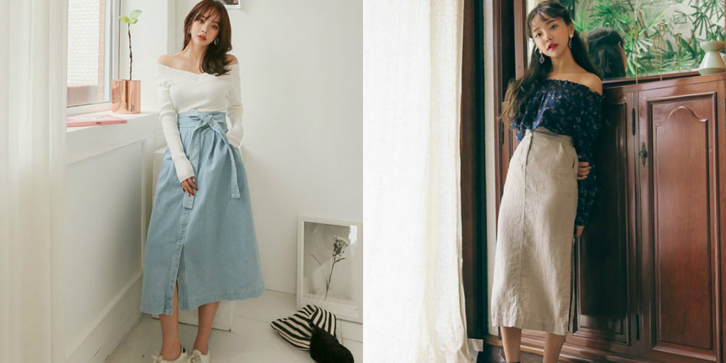 Kết hợp áo trễ vai với chân váy dài