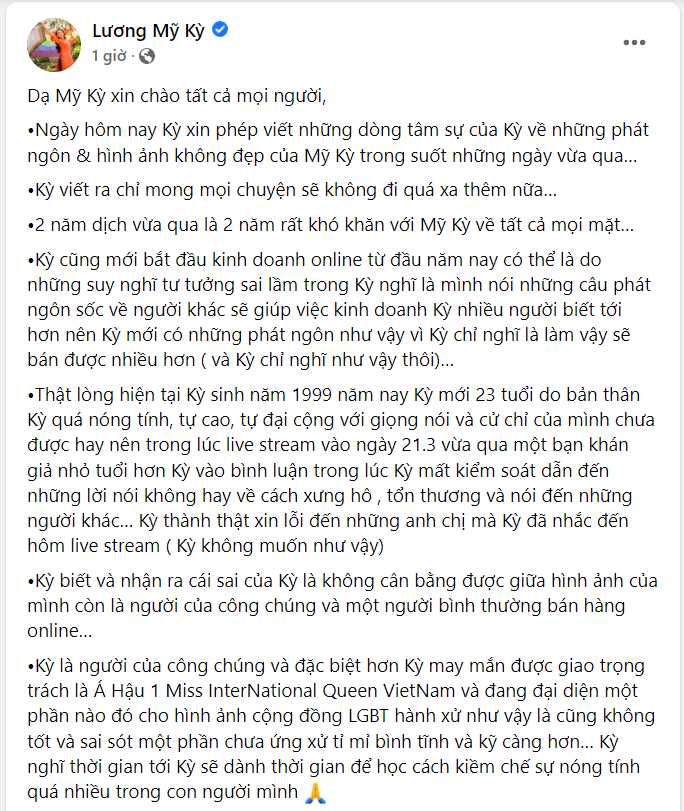 Cô viết: "Thật lòng hiện tại Kỳ sinh năm 1999 năm nay Kỳ mới 23 tuổi do bản thân Kỳ quá nóng tính, tự cao, tự đại cộng với giọng nói và cử chỉ của mình chưa được hay nên trong lúc livestream vào ngày 21.3 vừa qua một bạn khán giả nhỏ tuổi hơn Kỳ vào bình luận trong lúc Kỳ mất kiểm soát dẫn đến những lời nói không hay về cách xưng hô, tổn thương và nói đến những người khác… Kỳ thành thật xin lỗi đến những anh chị mà Kỳ đã nhắc đến hôm livestream (Kỳ không muốn như vậy)."