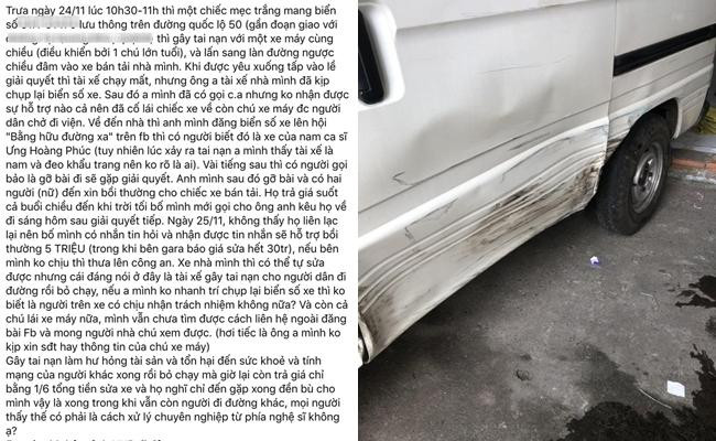 Chủ nhân bài viết khẳng định sau khi đăng tải thông tin lên group trên mạng xã hội thì truy ra biển số xe gây tai nạn trùng khớp với xe của ca sĩ Ưng Hoàng Phúc. Người này chia sẻ thêm: "Có người gọi bảo là gỡ bài đi sẽ gặp giải quyết. Họ trả giá suốt cả buổi chiều, kêu hỗ trợ bồi thường 5 triệu (trong khi bên gara báo giá sửa hết 30 triệu), nếu bên mình không chịu thì thưa lên công an. Gây tai nạn làm hư hỏng tài sản và tổn hại đến sức khỏe và tính mạng của người khác xong rồi bỏ chạy mà giờ lại còn trả giá chỉ bằng 1/6 tổng tiền sửa xe."