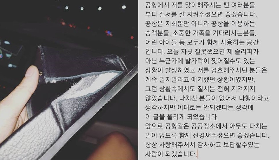 Trên tài khoản Instagram có tới hơn 15 triệu người theo dõi, Chanyeol tâm sự “Mình hy vọng từ giờ trở đi, các bạn fan đến chào đón mình tại sân bay sẽ giữ được trật tự tốt hơn. Sân bay là khu vực công cộng, có rất nhiều hành khách cùng ở đó chứ không phải chỗ dành riêng cho chúng ta. Mọi người đến đó để chờ mong người thân, rồi còn cả rất nhiều em nhỏ nữa.