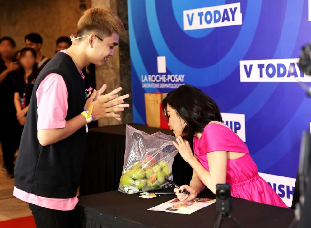 Trong outfit hường phấn đơn giản, Bích Phương đã gặp gỡ và ký tặng fan thân thiết - 30 thành viên Fanship may mắn nhất. Các fan đã đến rất sớm và mang nhiều quà tặng nữ ca sĩ. Bất ngờ nhất dành cho Bích Phương là túi hoa quả toàn xoài xanh khiến cô nàng không thể không ngó nhìn thật lâu.