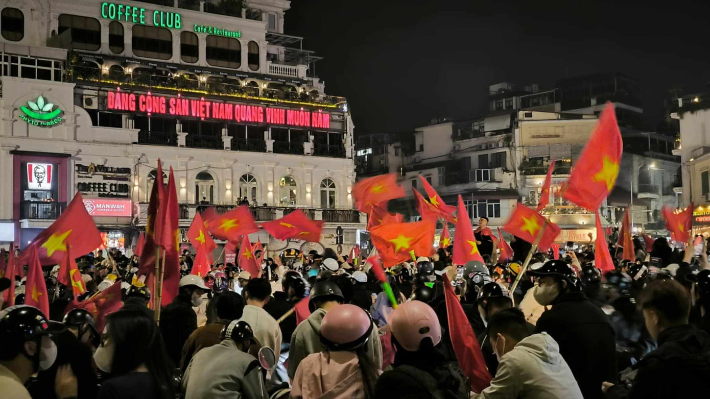 Tại Hà Nội, sau khi trận chung kết lượt đi khép lại với chiến thắng 2-1 của tuyển Việt Nam trước Thái Lan, không khí sôi động tràn ngập nhiều đường phố. Các CĐV xuống đường ăn mừng chiến thắng của thầy trò HLV Kim Sang-sik. Biển người hân hoan. Cờ đỏ sao vàng bay phấp phới. Tiếng reo hò bất tận. Niềm tự hào chiến thắng lan tỏa khắp nơi nơi!