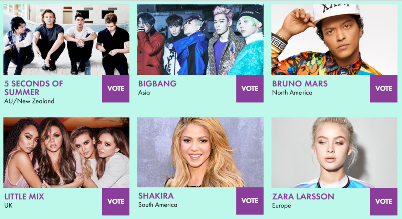 Vừa qua, kênh truyền hình Nickelodeon công bố danh sách đề cử của Kids' Choice Awards (KCA). Nhóm nhạc Hàn Quốc BIG BANG đã được chọn để trở thành nghệ sĩ đại diện cho châu Á tại hạng mục Favorite Global Music Star. Những đối thủ của BIG BANG gồm có 5 Seconds of Summer (AU/ New Zealand), Bruno Mars (Bắc Mỹ), Little Mix (Anh), Shakira (Nam Mỹ) và Zara Larsson (Châu Âu). Đây là một giải thưởng khá mới mẻ của KCA.