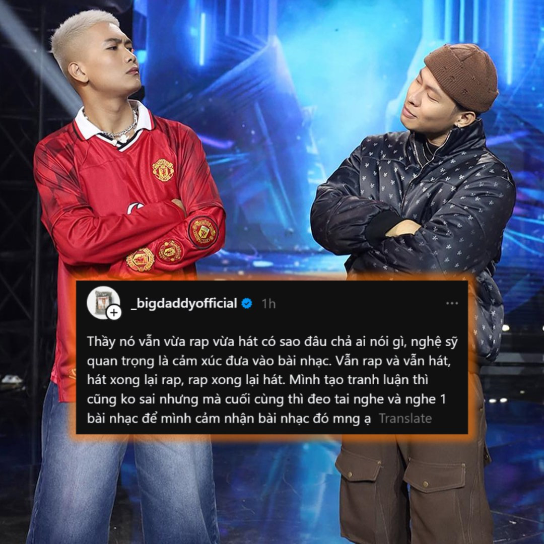 Đáng chú ý, ở phần bình luận, netizen bắt gặp BigDaddy có động thái bảo vệ học trò HURRYKNG và hậu bối HIEUTHUHAI. Với kinh nghiệm gần 20 năm trong nghề, nam rapper sinh năm 1991 bày tỏ: "Thầy nó vẫn vừa rap vừa hát có sao đâu chả ai nói gì, nghệ sĩ quan trọng là cảm xúc đưa vào bài nhạc. Vẫn rap và vẫn hát, hát xong lại rap, rap xong lại hát. Mình tạo tranh luận thì cũng không sai nhưng mà cuối cùng thì đeo tai nghe và nghe một bài nhạc để mình cảm nhận bài nhạc đó mọi người ạ".