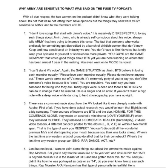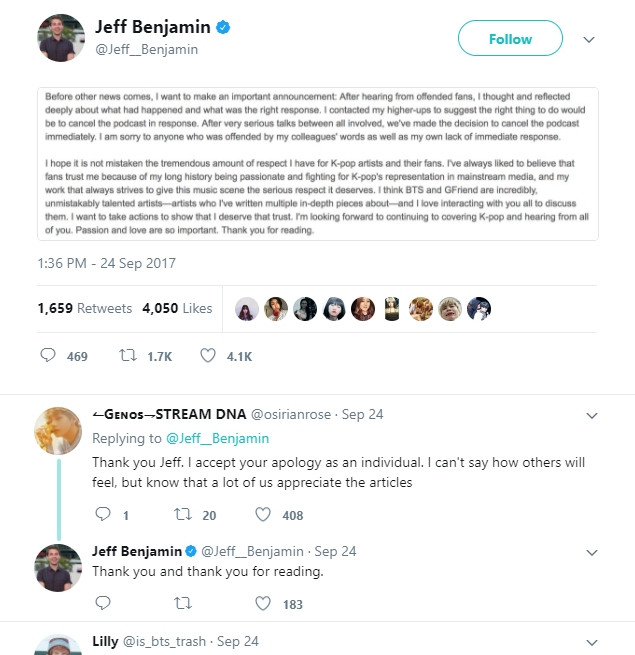Sau đó, anh gửi lời xin lỗi: “Tôi xin lỗi bất kì ai cảm thấy bị xúc phạm vì lời nói từ đồng nghiệp của tôi cũng như vì sự hồi đáp chậm trễ của tôi”. Cuối cùng, anh nhấn mạnh “sự tôn trọng to lớn” anh dành cho những nghệ sĩ K-Pop. Sự việc cũng làm dấy lên tranh cãi giữa cư dân mạng về giới hạn của việc bày tỏ "quan điểm cá nhân".