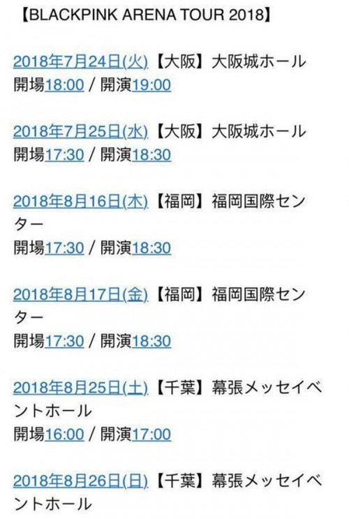 Ngày 27/3, YG Entertainment xác nhận thông tin BlackPink đang chuẩn bị cho tour diễn tại Nhật Bản đầu tiên vào cuối tháng 7. Chuỗi BLACKPINK Arena Tour 2018 gồm 6 concert được tổ chức ở 3 thành phố Osaka, Fukuoka và Chiba.