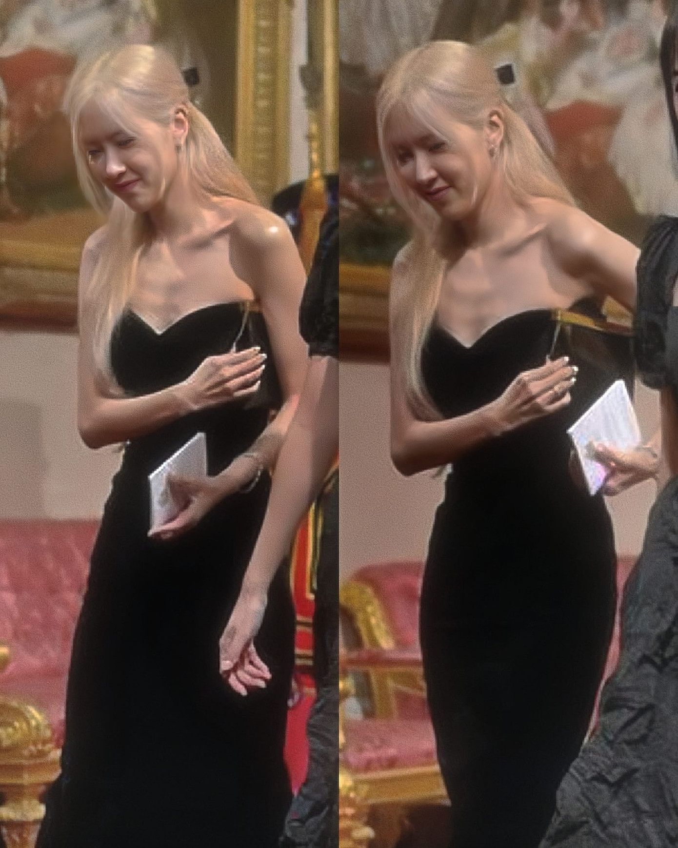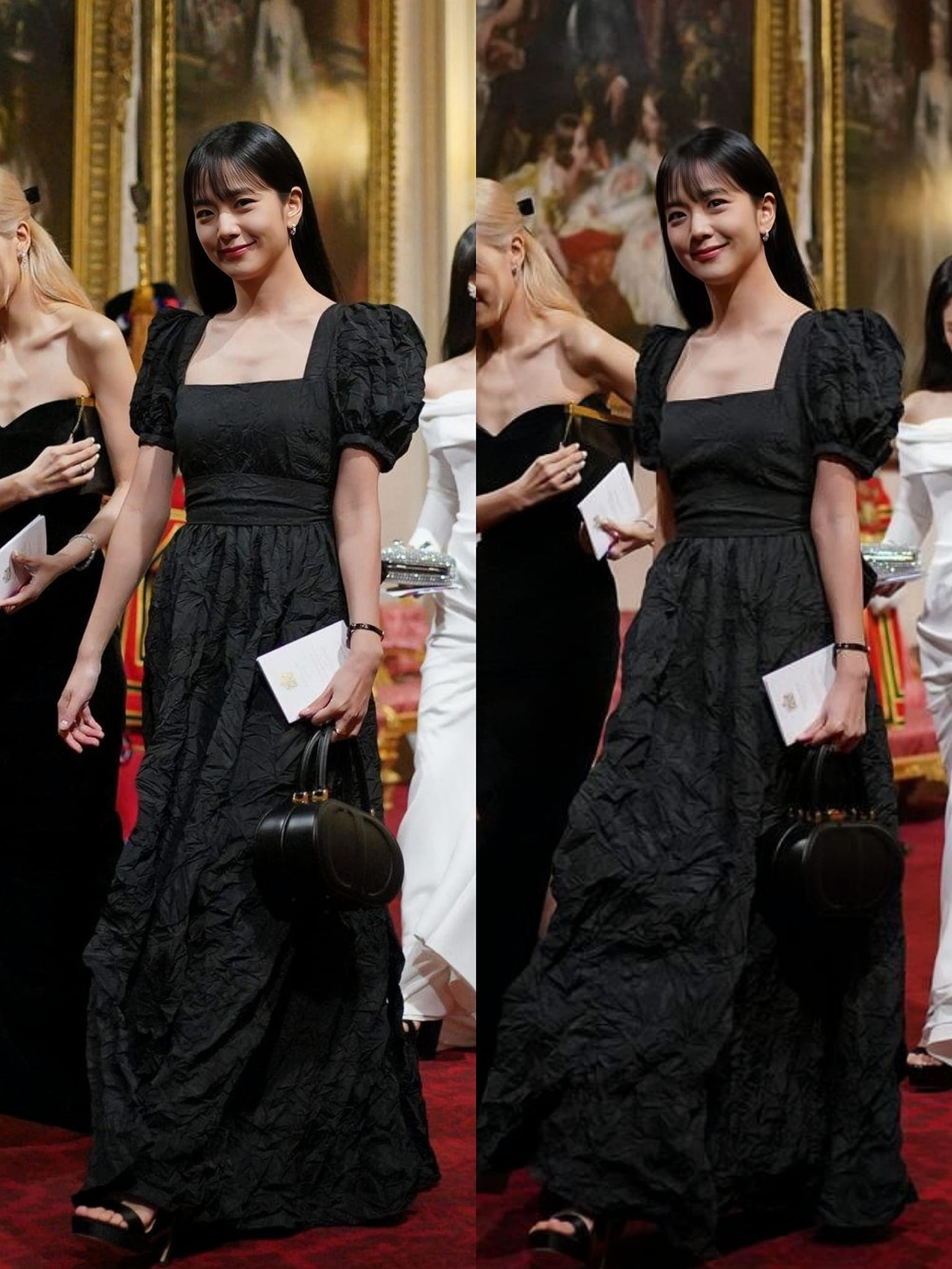 Xuất hiện trong bữa tiệc chiêu đãi cấp quốc gia, tổ chức tại Cung điện Buckingham, BLACKPINK có màn xuất hiện thu hút ánh nhìn với trang phục dạ hội. Ứng dụng xu hướng “giàu ngầm”, các thành viên lựa chọn những thiết kế với màu sắc nhã nhặn, trung tính như xanh ngọc, đen, trắng.