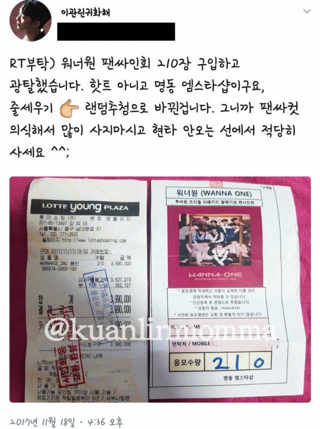 Mới đây, một fan đã buồn rầu đăng tấm ảnh hóa đơn mua tới 213 album với lời than thở “Mình đã có tới 213 vé số tham gia bốc thăm vé dự fan sign của Wanna One, đã bỏ ra 4,2 triệu won (khoảng 90 triệu đồng) mà vẫn trượt đây này”. Rất nhiều fan khác cũng cùng chung cảnh ngộ như “Chị gái mình mua tới 100 bản cũng có trúng đâu”, “Cả đời mình chưa bao giờ trúng thưởng cái gì hết mà”, “Khi nào mình mới có thể gặp và trò chuyện với Wanna One chứ”, “Mình biết một người mua tới 300 bản đĩa và cuối cùng đã trúng vé rồi đấy”.