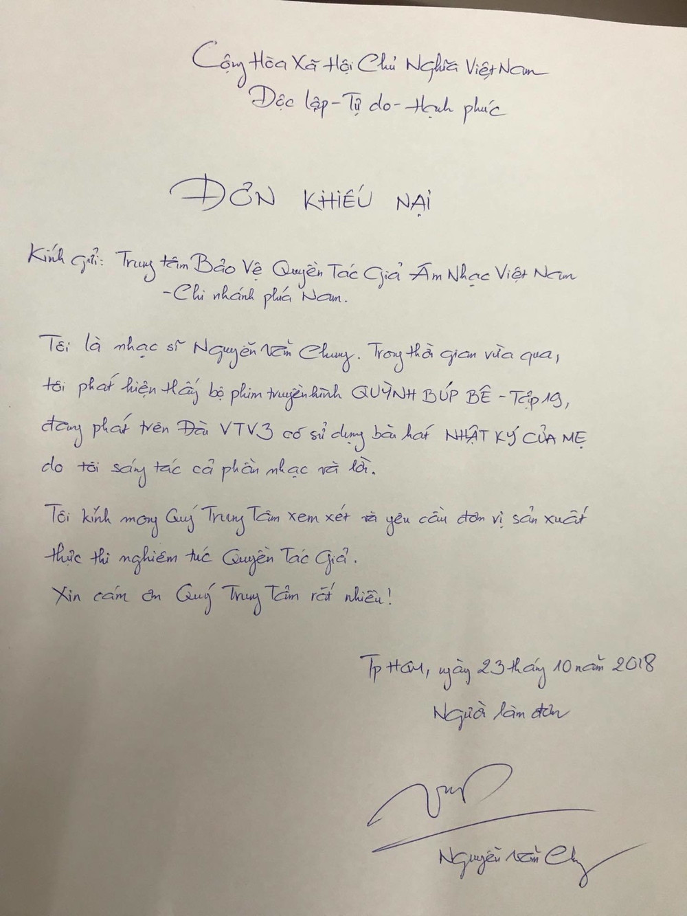Trong đơn gửi vào ngày 23/10, Nguyễn Văn Chung mong muốn cơ quan chức năng yêu cầu đơn vị sản xuất thực hiện nghiêm túc Quyền tác giả.