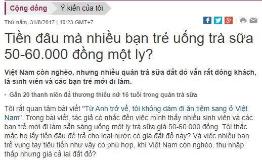 Trên Facebook đang chia sẻ "rần rần" bài viết trên một trang báo mạng có tiêu đề “Tiền đâu mà nhiều bạn trẻ Việt Nam uống trà sữa 50.000 - 60.000 đồng một ly?”. Bài viết ngay lập tức gây nên một “cơn bão”, và nhận được nhiều ý kiến trái chiều từ cộng đồng mạng.