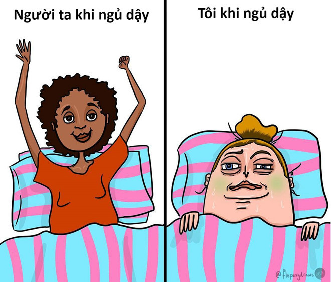 Dường như con gái có hàng trăm vấn đề để quan tâm mỗi ngày, từ đầu tóc, trang điểm, quần áo đến công việc và cả chuyện nội trợ. Những bức tranh miêu tả rắc rối trong cuộc sống thường ngày của họa sĩ trẻ Flo Perry cũng chính là nỗi khổ tâm chung của nhiều cô gái khác. Trong tưởng tượng, các cô nàng sẽ thức dậy với gương mặt tươi tắn, rạng ngời nhưng thực tế thì không được xinh đẹp như vậy.
