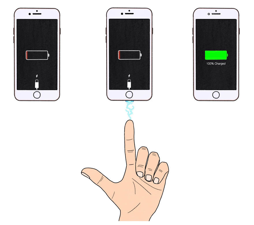 Hết pin điện thoại luôn là một vấn đề khiến chúng ta khó chịu. Điều này có thể giải quyết trong tức khắc nếu có nguồn điện an toàn, phát ra trực tiếp từ ngón tay của chúng ta. Như Spider man phun mạng nhện, chúng ta cũng dễ dàng sạc pin điện thoại trong tức khắc mà không cần đến bất cứ vật dụng hay nguồn điện nào.