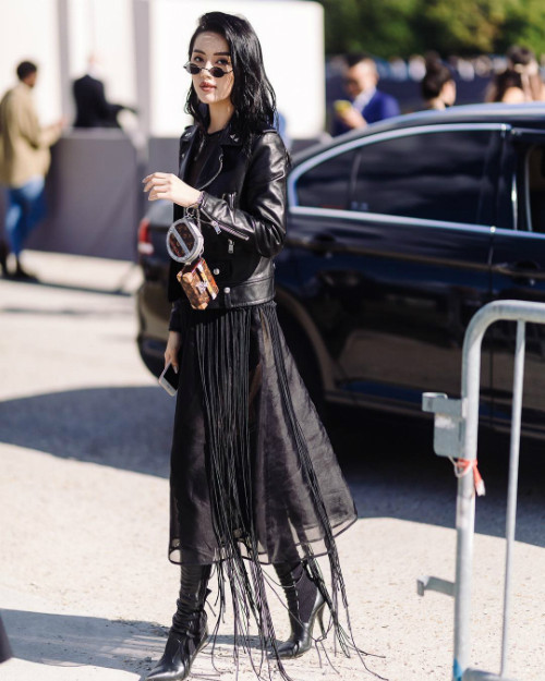 Chiếc váy tua rua cá tính được "Nữ hoàng lookbook" phối cùng biker jacket của Yves Saint Laurent có giá hơn 40 triệu đồng. Boots Fendi hơn 37 triệu đồng được cô kết hợp cùng khuyên tai của Cartier, túi mini Louis Vuitton.