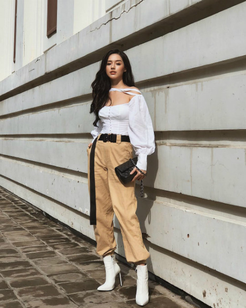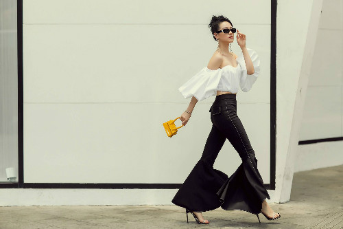 Cập nhật street style trên trang cá nhân, mỗi bức hình của Khánh Linh thu hút hàng nghìn lượt yêu thích. Trong hình, cô dùng chiếc túi CC Filigree Vanity Case của Chanel có giá hơn 100 triệu đồng để mix cùng áo trễ vai và quần thụng hợp trend.