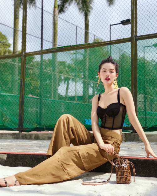 Mẫu túi nhỏ xinh nhà Fendi được Khánh Linh mua với giá 39 triệu đồng. Cô kết hợp item này cùng quần thụng cạp cao và áo hai dây crop - top.