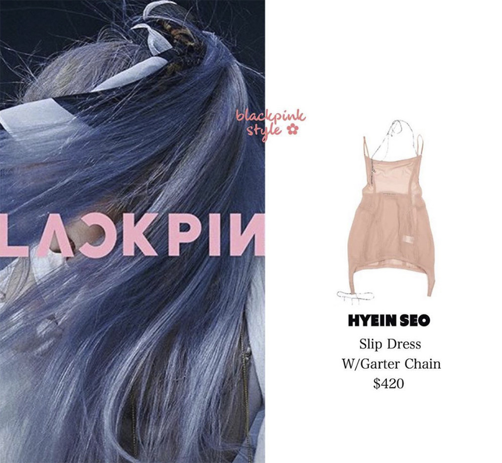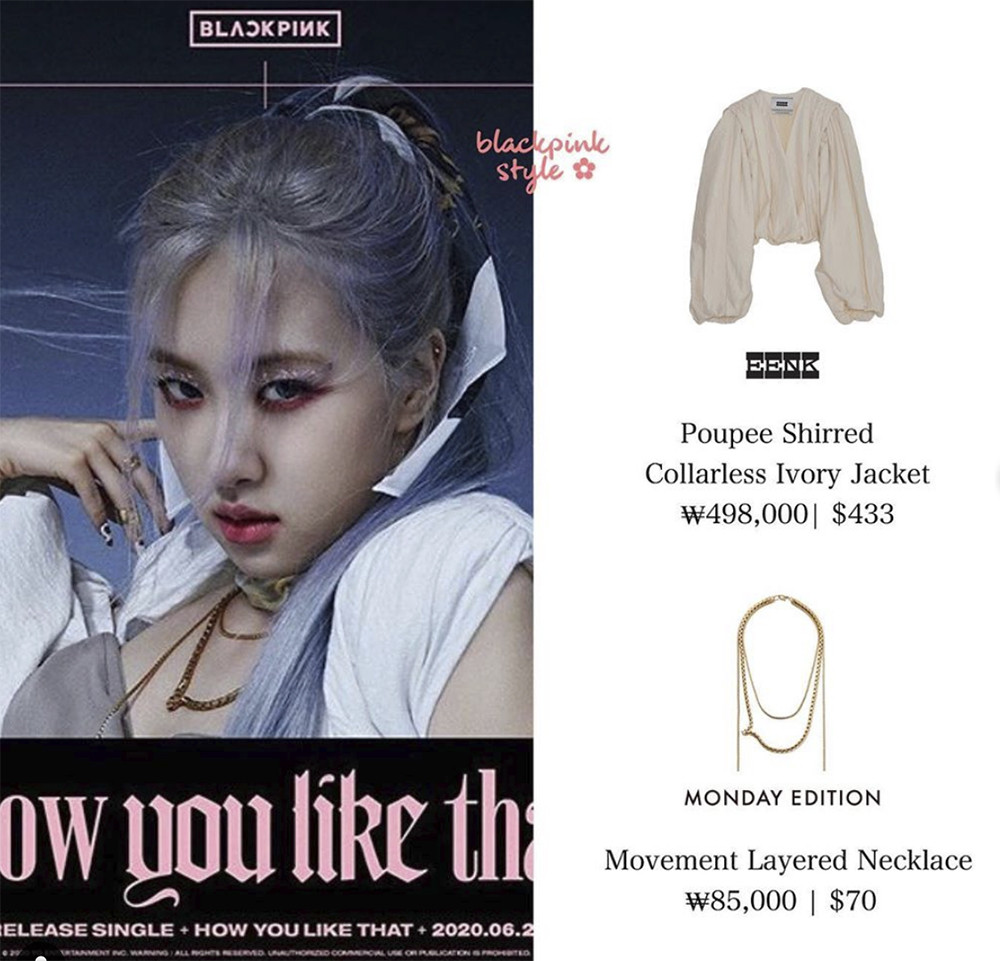 Rosé với mái tóc khói được các fan hết lời ngợi khen trong đợt comeback này. Chiếc vòng cổ Rosé đeo đến từ thương hiệu MONDAY EDITION có giá 85,000 won (khoảng 1.6 triệu đồng), cô mặc áo khoác của hãng EENK có giá khoảng 9.5 triệu đồng, váy của HYEIN SEO có giá gần 10 triệu đồng.
