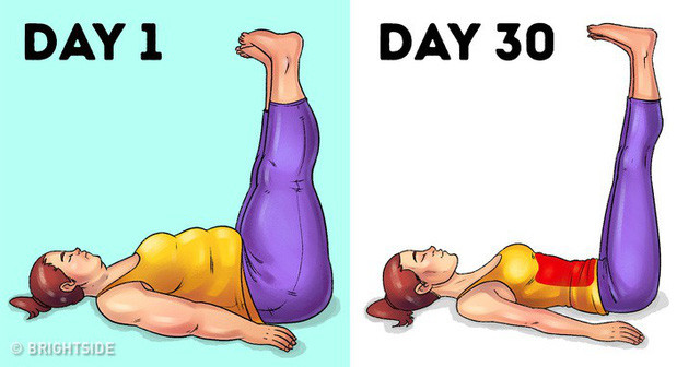 Duỗi chân: Nằm ngửa và đặt tay lên sàn để cân bằng. Từ từ nâng chân của bạn lên cao từ 10 đến 15 lần. Bạn sẽ bắt đầu nhận thấy sự tiến bộ chỉ trong 30 ngày.