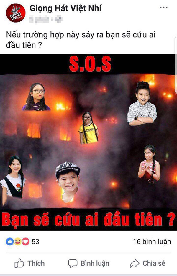 Tối 30/3, fanpage của chương trình truyền hình The Voice Kids - Giọng hát Việt nhí đã làm dậy sóng cộng đồng mạng khi bất ngờ đăng một bức ảnh ghép hình ảnh các cô cậu bé từng tham gia chương trình như Quang Anh, Phương Mỹ Chi vào khung cảnh hỏa hoạn cùng dòng chữ "S.O.S - Bạn sẽ cứu ai đầu tiên?".