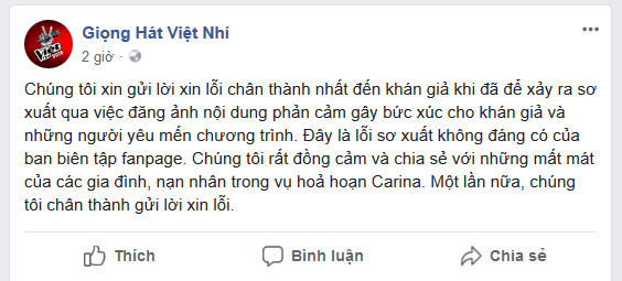 Ngay sau đó, Ban tổ chức The Voice Kids đã ra thông báo chính thức về vụ việc. Cũng thông qua fanpage này, Ban tổ chức chương trình nhận sai, đồng thời gửi lời xin lỗi đến khán giả: "Chúng tôi xin gửi lời xin lỗi chân thành nhất đến khán giả khi đã để xảy ra sơ xuất qua việc đăng ảnh nội dung phản cảm gây bức xúc với khán giả và những người yêu mến chương trình. Đây là sơ xuất không đáng có và là lỗi của biên tập fanpage. Chúng tôi rất đồng cảm và chia sẻ với những gia đình, nạn nhân trong vụ hoả hoạn Carina. Một lần nữa, chúng tôi chân thành gửi lời xin lỗi".