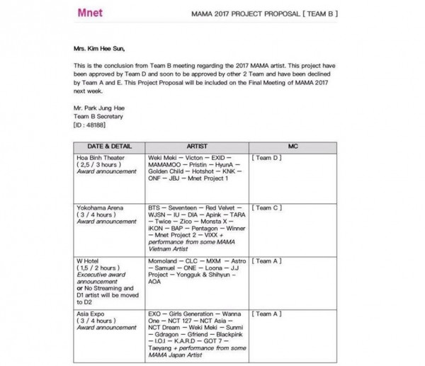 Sau đó không lâu, một bản danh sách các nghệ sĩ tham dự MAMA 2017 nhanh chóng được lan truyền trên các mạng xã hội. Bản danh sách ghi cụ thể chi tiết các nghệ sĩ tham gia tại từng khu vực, trong đó nghệ sĩ Hàn Quốc xuất hiện tại nước ta sẽ bao gồm: Weki Meki, Victon, EXID, MAMAMOO, Pristin, HyunA, Golden Child, Hotshot, KNK, ONF, JBJ, Mnet Project 1.