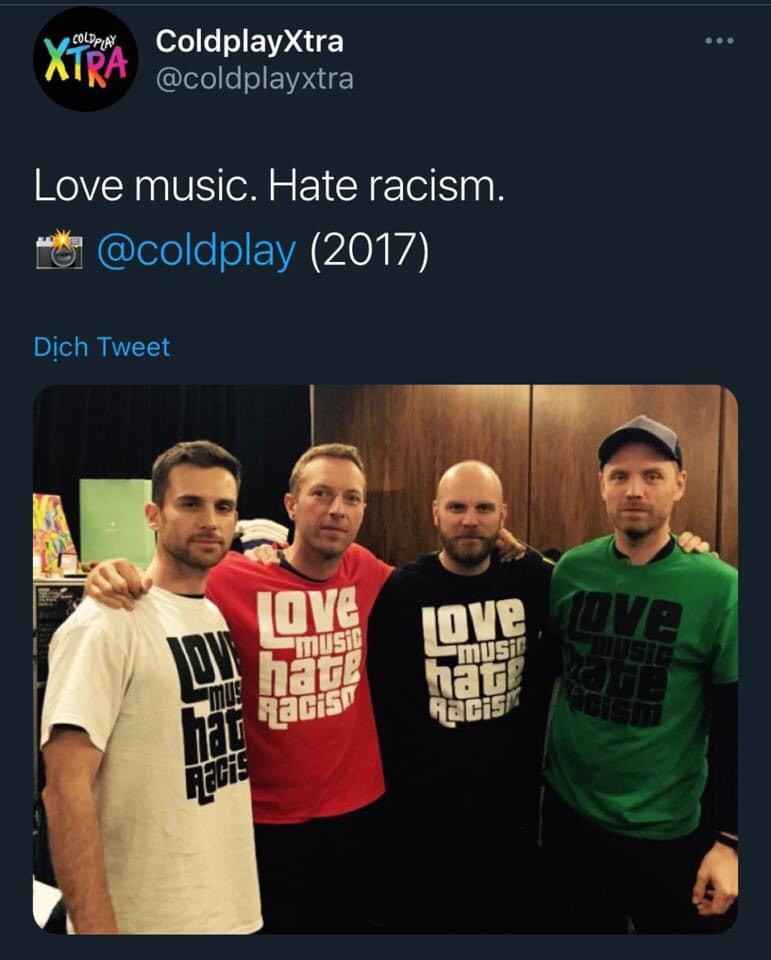 Chủ nhân của ca khúc "Fix You" - nhóm nhạc Coldplay cũng lên tiếng: "Chúng tôi yêu âm nhạc và ghét sự phân biệt chủng tộc". BTS đã cover "Fix You" tại "MTV Unplugged Presents" và nhận được sự tán dương của Coldplay.