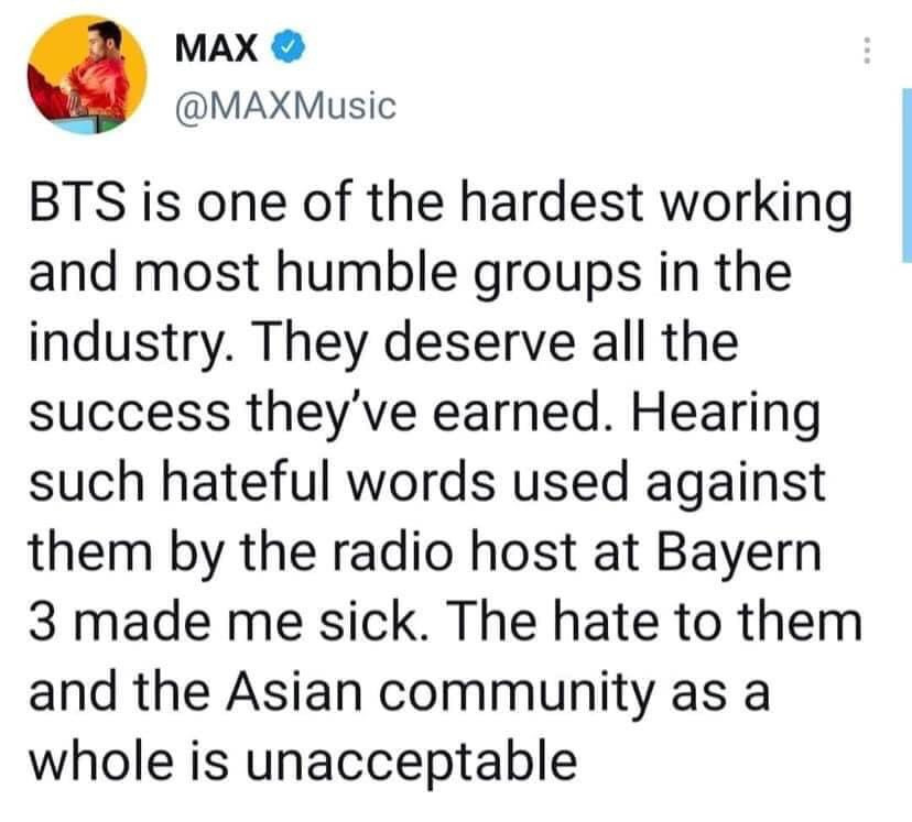 Max - nam ca sĩ từng hợp tác với Suga cũng nêu rõ quan điểm: "BTS là một trong những nghệ sĩ chăm chỉ và khiêm nhường nhất mà tôi từng thấy. Họ xứng đáng có được thành công ứng với công sức đã bỏ ra. Nghe thấy những so sánh và nhận xét độc hại đến từ MC của đài Bayern 3 làm tôi khó chịu. Chẳng có lấy một lí do gì để sự kì thị người Châu Á ấy được chấp nhận."