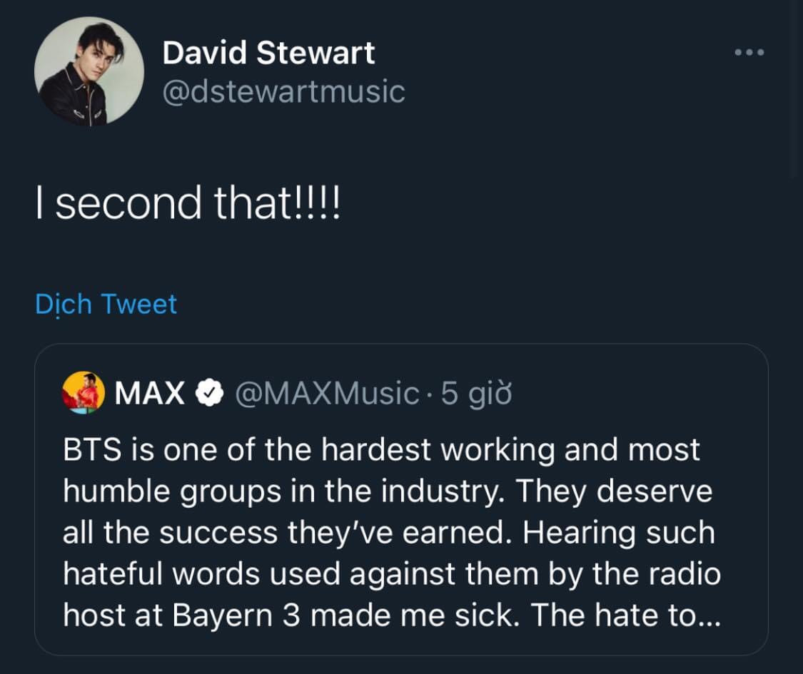 Nhạc sĩ đồng sáng tác ca khúc "Dynamite" - David Stewart tweet lại chia sẻ của Max: "Tôi cũng thế."