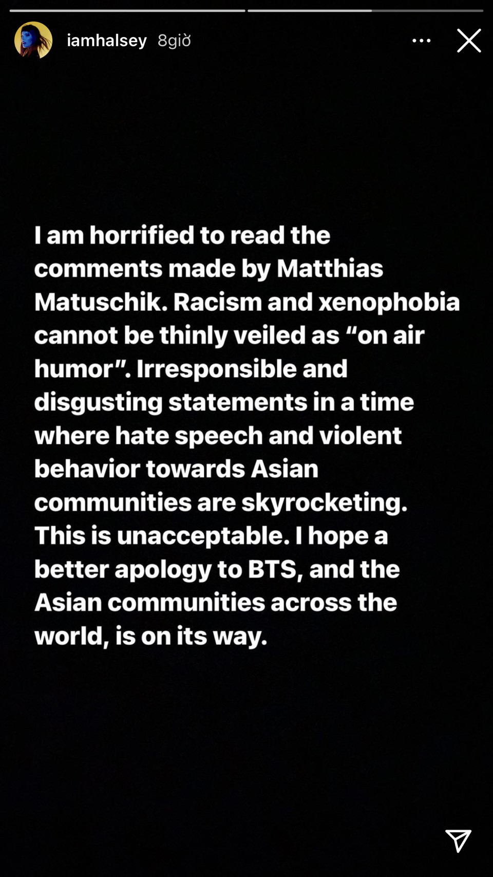 Quan điểm của nữ ca sĩ Halsey: "Thật khủng khiếp khi đọc được những bình luận như thế đến từ Matthias,. Phân biệt chủng tộc hay bài ngoại không phải là "trò đùa vu vơ trên sóng radio". Giữa tình trạng bạo lực người châu Á đang gia tăng, sẽ thật vô trách nhiệm và xấu xa khi thốt lên những lời như thế. Tôi cần một lời xin lỗi xứng đáng được gửi đến BTS và cộng đồng người châu Á trên toàn thế giới."