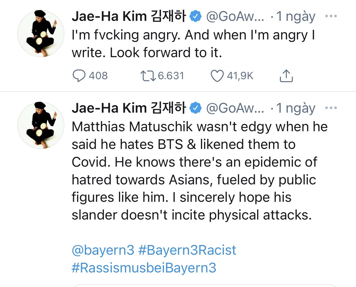 Kim Jae Ha - một cây bút có tiếng tại Hàn Quốc lên tiếng: "Matthias Matuschik dường như đang thiếu tỉnh táo khi anh ta lên án BTS và so sánh họ với đại dịch COVID ngoài kia. Anh ta biết rằng người châu Á đang phải đối mặt với cơn đại dịch khác đến từ những người giống anh ta. Hi vọng rằng những lời vu khống mà anh ta đã nói ra không xuất phát từ những tác động bên ngoài."