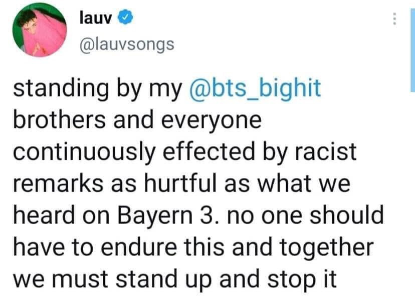 Lauv - nam ca sĩ từng hợp tác với BTS chia sẻ: "Tôi đứng về phía BTS và tất cả những ai đang phải chịu tổn thương bởi lời phân biệt chủng tộc của đài Bayern 3. Không ai trong chúng ta buộc phải chịu đựng những điều ấy, và tư tưởng kia cần phải được dừng lại."