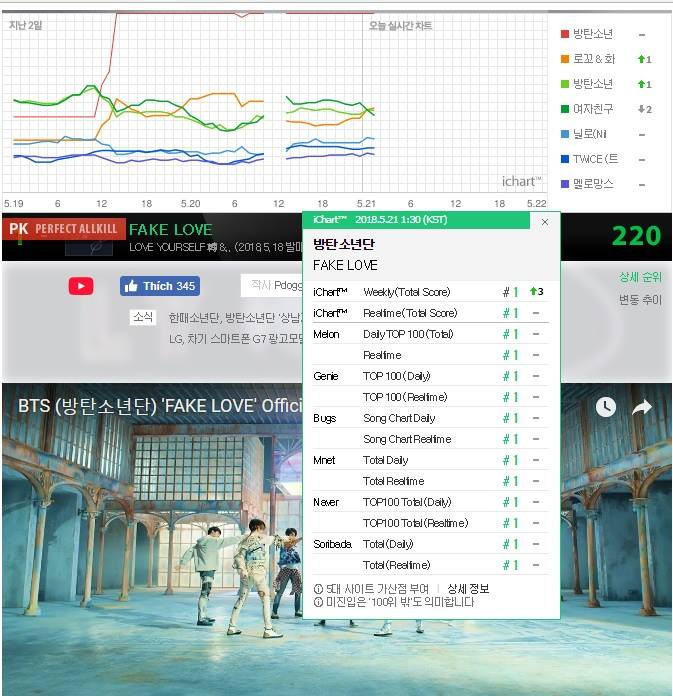 BTS đã phát hành ca khúc chủ đề Fake Love thuộc full album thứ ba Love Yourself: Tear vào lúc 18h ngày 18/5 (theo giờ Hàn Quốc). Và đến 0h30 ngày 21/5 (theo giờ Hàn Quốc), sau khi iChart cập nhật lại bảng xếp hạng, Fake Love đã thành công đạt được chứng nhận PAK (Perfect All-Kill). Đây chính là PAK đầu tiên trong sự nghiệp của BTS kể từ khi debut đến nay. Không những vậy, Fake Love còn là ca khúc đạt PAK nhanh nhất kể từ khi thay đổi hệ thống xếp hạng (chỉ sau 54 giờ đã đạt PAK).