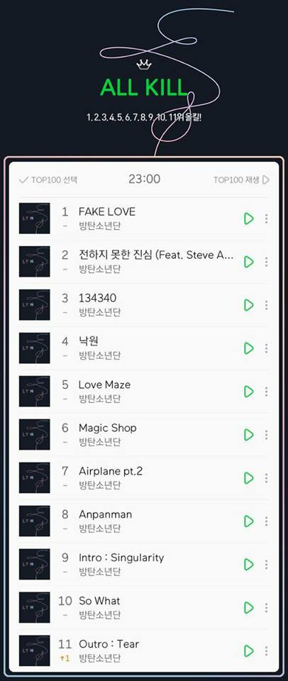 Không những thế, BTS còn All-kill tuyệt đối trên MelOn - BXH "khó nhai" nhất Hàn Quốc khi 11 ca khúc trong album Love Yourself: Tear chiếm trọn 11 vị trí đầu tiên.