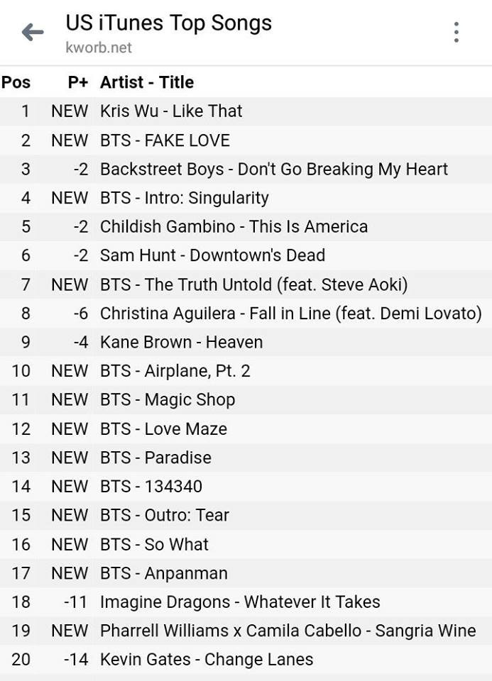Cực kỳ ngoạn mục là trên BXH US iTunes Top Song, tất cả 11 bài hát trong album đều lọt vào Top 20, trong đó Fake Love đạt No.2. BTS là nghệ sĩ thứ hai sau Adele có tất cả các bài hát trong cùng một album đều góp mặt trong Top 20 US iTunes Top Song Chart.