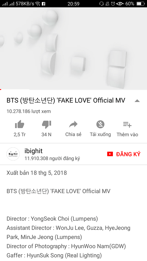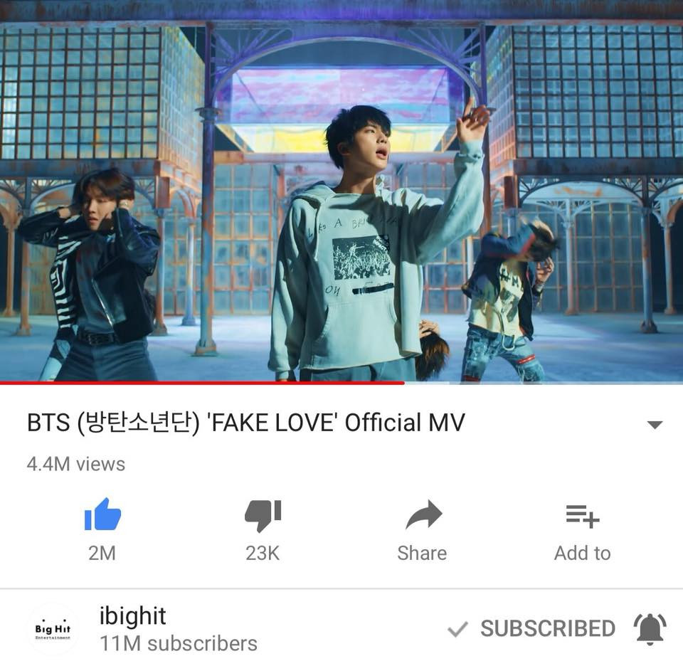 Vào khoảng 21h tối ngày 18/5 (theo giờ Việt Nam), MV Fake Love đã vượt mốc 10 triệu view. Với thành tích này, BTS đã trở thành nghệ sĩ sở hữu MV đạt 10 triệu view nhanh nhất lịch sử YouTube từ trước đến nay khi chỉ mất 4 giờ 57 phút.