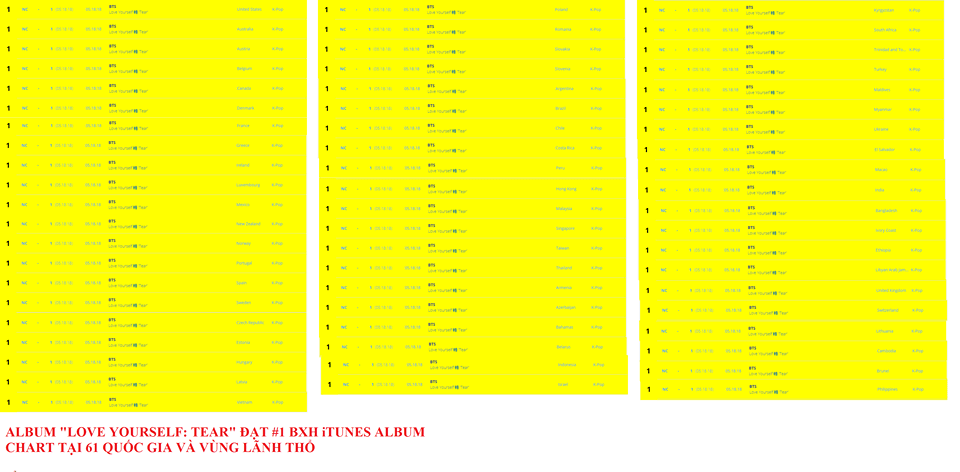 Ảnh cập nhật lúc Love Yourself: Tear No.1 tại 61 quốc gia và vùng lãnh thổ. Nguồn: BTS Chart & Sale.
