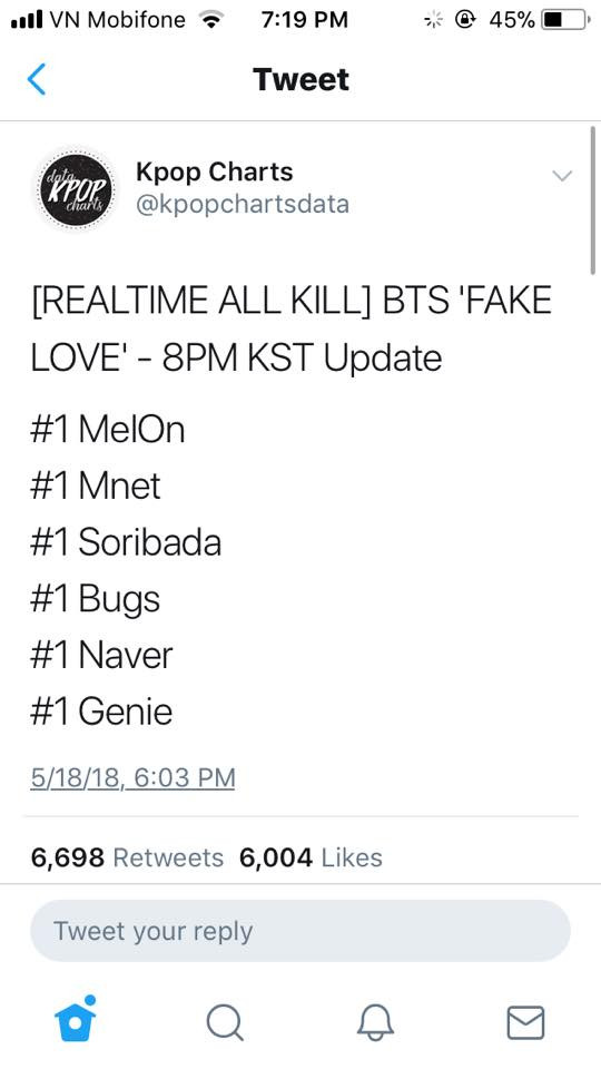 Vào lúc 18h ngày 18/5 (theo giờ Hàn Quốc), BTS đã chính thức trở lại với album phòng thu thứ ba mang tên Love Yourself: Tear cùng bài hát chủ đề Fake Love. Không ngoài dự đoán, chỉ ít lâu sau khi trở lại, BTS đã tiếp tục vượt lên chính mình và đạt được những thành tích rất đáng nể.