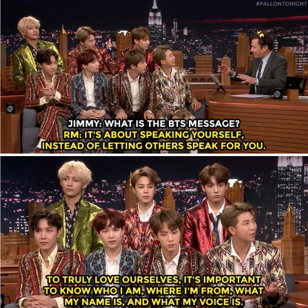 Ngày 25/9 (giờ địa phương), tại show The Tonight Show Starring Jimmy Fallon, các chàng trai BTS xuất hiện với tư cách khách mời. Ngay khi Jimmy Fallon giới thiệu "Hãy chào đón nhóm nhạc hàng đầu thế giới BTS", khán giả có mặt ở trường quay đã hò hét phấn khích, bày tỏ sự mong chờ dành cho những ngôi sao Kpop.