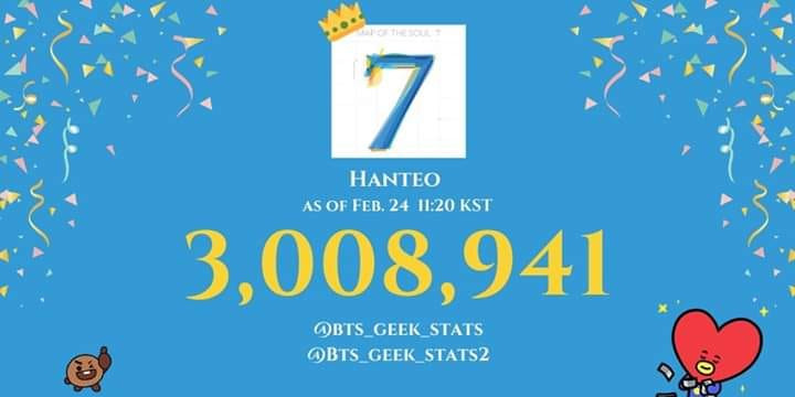 Tính đến 11h20 ngày 24/2 (theo giờ Hàn Quốc), BTS đã trở thành nghệ sĩ đầu tiên trong lịch sử Hanteo có album vượt mốc 3 triệu bản. BTS chỉ mất 3 ngày để cán mốc này.