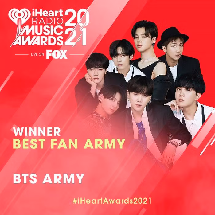 They couldn't have done it without you, #BTSArmy 💜 #BestFanArmy, #BestMusicVideo AND #BestChoreography! RT if you are so proud of the guys! #iHeartAwards2021 #BTS_Butter #BTS @bts_twt // @bts_bighit pic.twitter.com/PVP4fNagCV