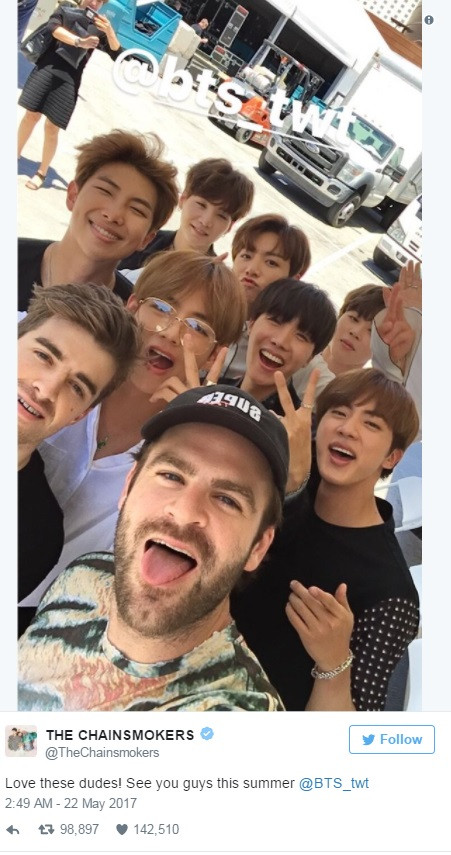Trước đó, BTS cũng đã gặp gỡ The Chainsmokers trong hậu trường, và cả hai bên đều tíu tít khoe ảnh chụp chung lên mạng xã hội.