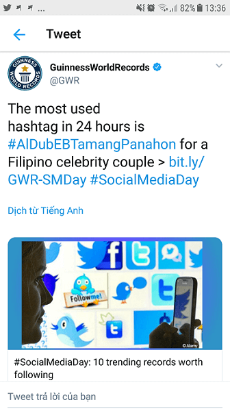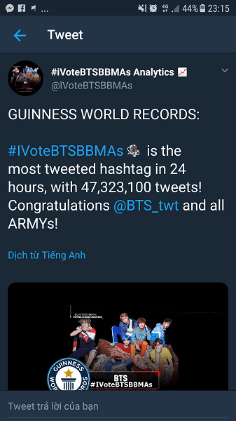 Như vậy, với 47.323.100 tweet, hashtag #iVoteBTSBBMAs đã vượt qua và bỏ xa kỷ lục cũ. Các A.R.M.Y đang rất vui mừng và đang chờ đợi Guinness xác nhận xem đây có phải là một kỷ lục thế giới mới hay không. Trong thời gian chờ đợi, các A.R.M.Y vẫn không quên nhiệm vụ, tiếp tục vote cho BTS tại Billboard Music Awards 2018.