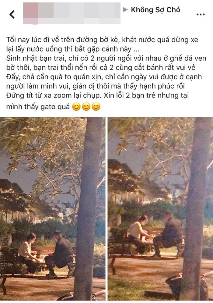 Sinh nhật bạn trai, chỉ có 2 người ngồi với nhau ở ghế đá ven bờ thôi, bạn trai thổi nến rồi cả 2 cùng cắt bánh rất vui vẻ