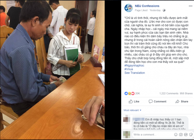 Cùng với tấm hình này, fanpage NEU Confession chú thích: “Chỉ là vô tình thôi, nhưng tôi hiểu được ánh mắt của người cha đó. Ước mơ cho con có được con chữ, cái nghĩa, là sự hi sinh vô bờ bến của người cha. Ngày nhập học - cái ngày mà mang lại niềm vui, sự hạnh phúc của các bạn tân sinh viên. Nhà nào có điều kiện thì dăm bảy triệu nó chẳng là gì, nhưng ở trong cái hoàn cảnh nông dân chân lấm tay bùn thì vài trăm thôi cũng đủ nói lên nỗi khổ! Chú bảo, thôi thì cố gắng cho cháu ra đây ăn học, nhà chú tận trong Nam, cũng chẳng có điều kiện gì nhiều, các cháu có gì ở đây chỉ giúp em cho chú. Thấy chú chắt bóp từng đồng tiền lẻ, một sấp một để đóng tiền học cho con mà thấy xót xa quá”.