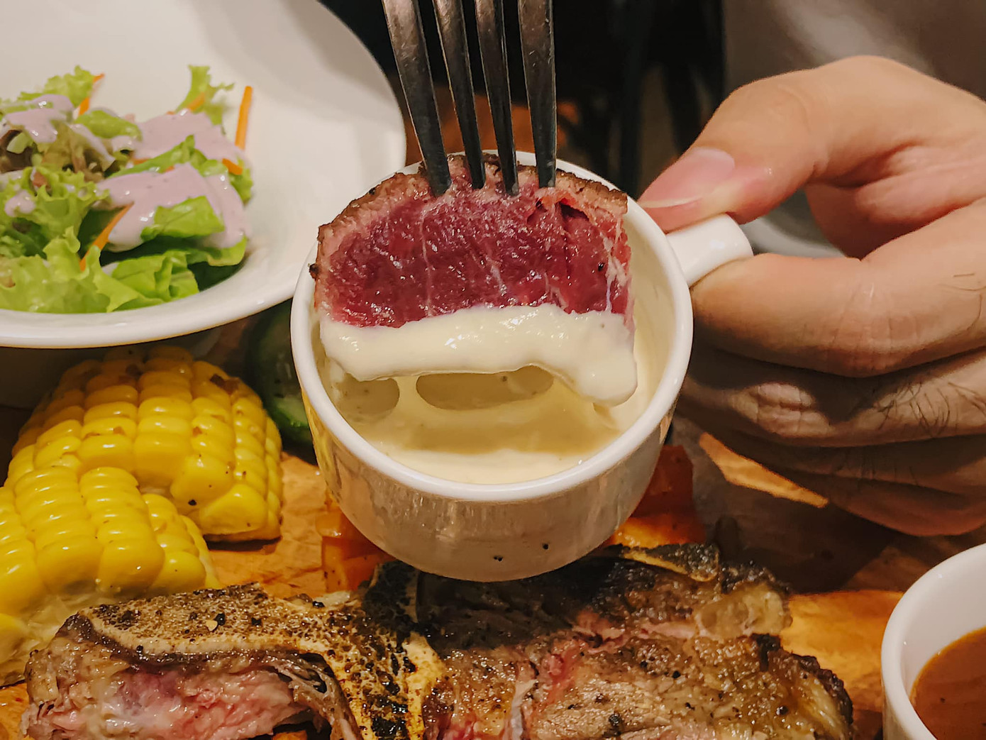 T-bone BBQ Sốt Blue Cheese (360K) một khay bò chữ T siêu đậm thịt (có thể chọn mức chín tái, chín vừa hay chín) kèm khá nhiều món phụ ăn kèm là món signature của tiệm. Không gian lãng mạn cũng là một điểm tuyệt vời khiến bạn mê tít chốn này!